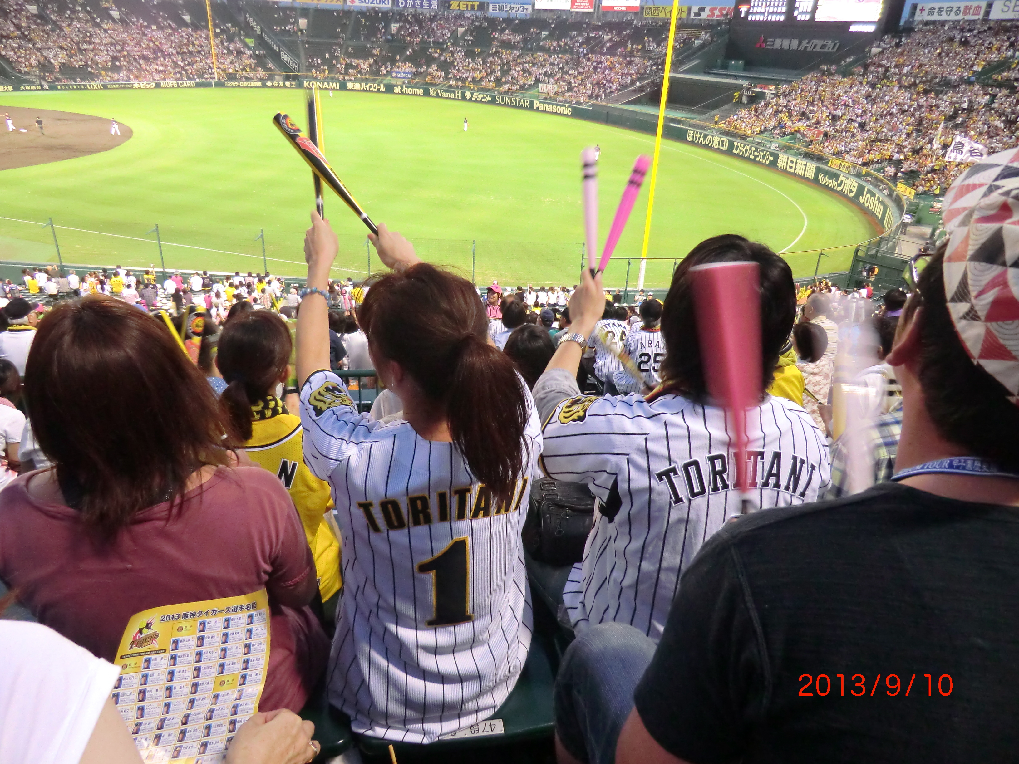 9月10日 親睦会イベントで甲子園へ行きました! 試合前に、スタジアムツアー †甲子園歴史館〜†3塁ブルペンの見学〜†高校野球インタビュースペースの見学〜†阪神OB亀山氏の練習生解説を見学〜†亀山氏との記念撮影・・・(記念撮影はサプライズでした) 甲子園スタンドで、じゃんけん大会&自己紹介・・そして7回にはラッキーセブンのジェット風船を飛ばし・・・祥雲館席は盛り上がりました(^^v 試合結果は、残念ながら延長12回引き分けで終わり、♪六甲おろし♪は歌えませんでしたが・・ (- -) 今回の親睦会イベントは、昼2時〜夜10時過ぎまでと・・長い時間でしたが、楽しい時間を過ごすことができました。