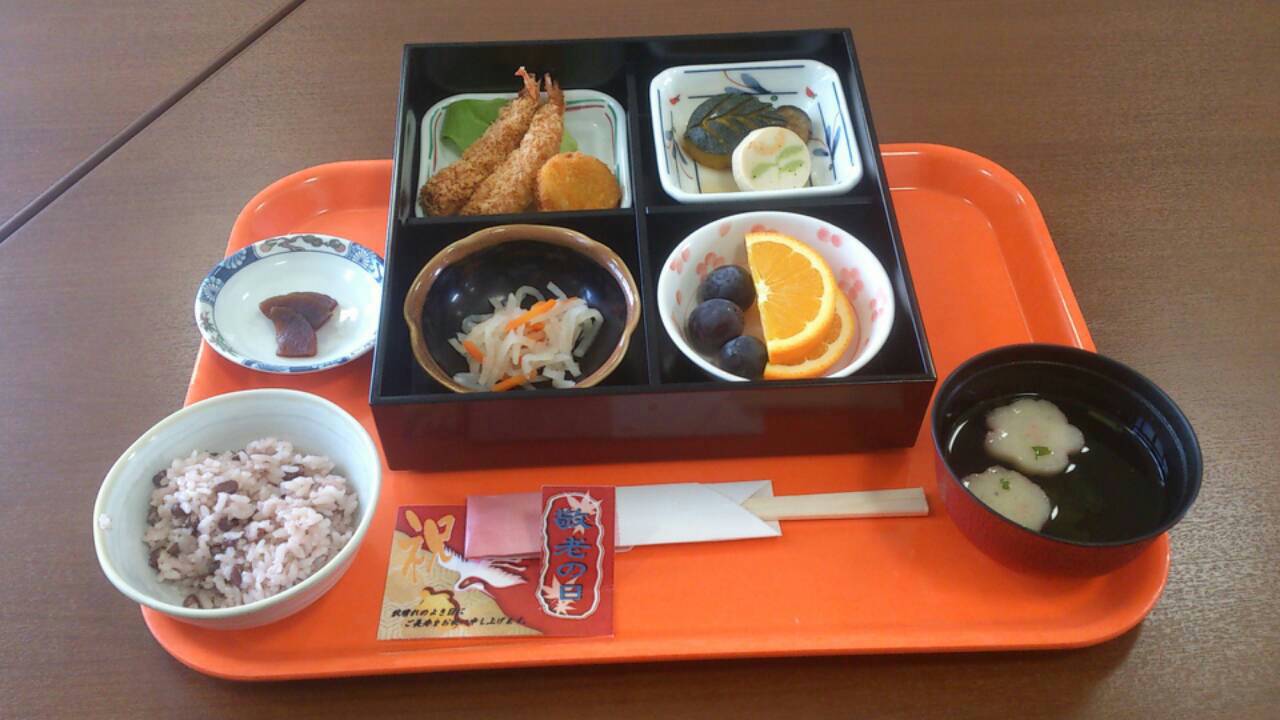 9月16日 ”敬老の日” にちなんで、祥雲館では、イベント盛りだくさんの一日でした。 ショートのお昼ご飯です。赤飯をつけて、おいしそうなお弁当に仕上げました。