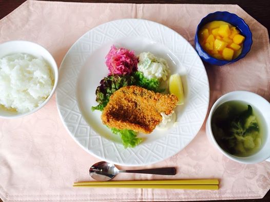 メインは、シェフがフロアで揚げてくれたサクサクのあじフライ タルタルソースに加え、レモンが添えられていたのが嬉しい。もちろん美味しくいただきました。 紫キャベツの甘酢和えは酸味もちょうどよく、彩りも鮮やか! それから、旬のソラマメを使ったポテトサラダにかきたまスープ、 デザートには手作りマンゴープリン♡ とても豪華なランチに利用者様、スタッフとも大満足、自然に笑みのこぼれるお昼となりました^o^ シアワセ(^o^)/