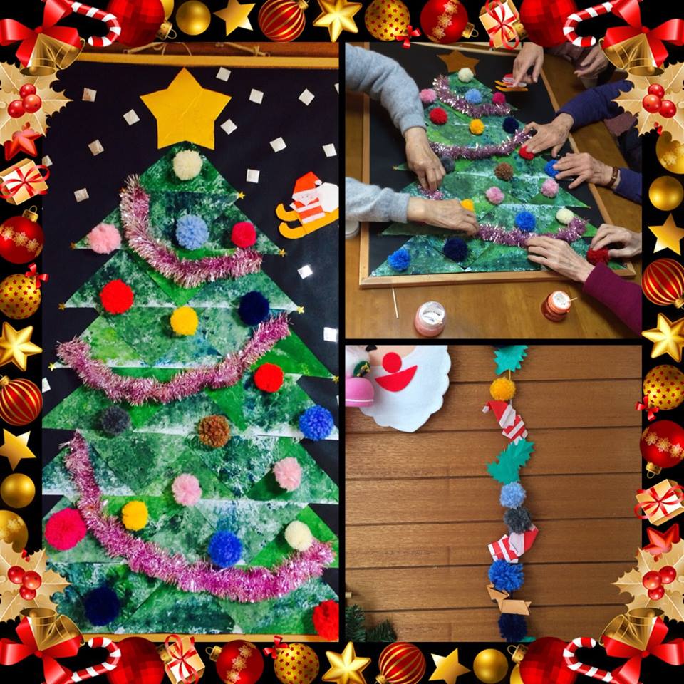 ☆ すみれ クリスマスの壁画が完成しました!!! モミの木は、絵の具を使って用紙を作り、それを三角形に切って組み合わせを考えながら貼り付けました。 飾りは、利用者さん全員に毛糸でボンボンを作っていただいたものを使っています(^^) すみれのみ‾んなで仕上げた作品が、お部屋をにぎやかにしてくれています‾。