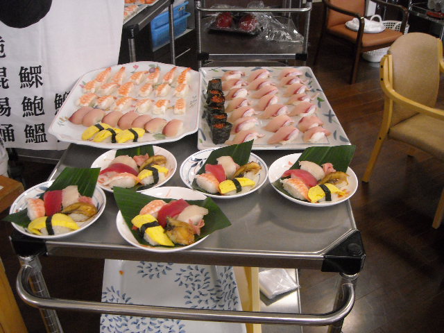 祥雲館では、「寿司ロボ」という、にぎり寿司のしゃりを作る機会を借りて、出来立てのにぎり寿司を召し上がっていただいています。 今年も、お寿司を楽しみにされていたご利用者様達は、お腹いっぱい召し上がられました。 お寿司のネタは、エビ・マグロ・あなご・イカなど・・・