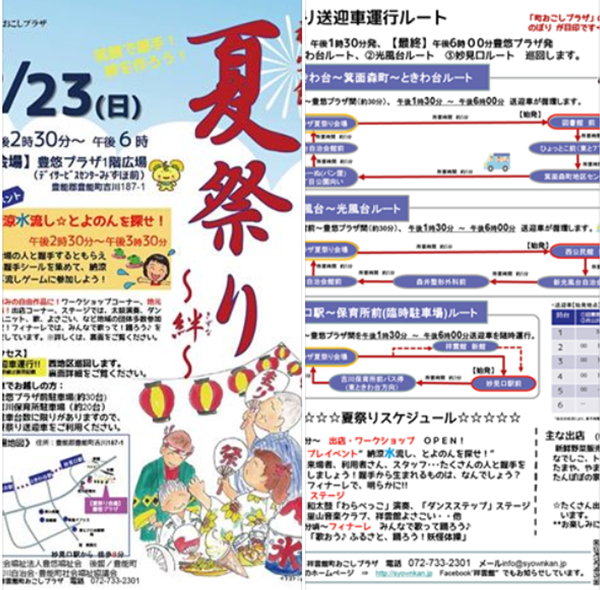 今年も開催します!! 昨年に引き続き、町おこしプラザでは、祥雲館夏祭りを開催します。 今年のテーマは『〜絆〜笑顔で握手!絆を作ろう!』です。 今年の夏祭りは、 施設の利用者さん、ご家族様、そして地域の皆様と、祥雲館スタッフが、ふれあいながら、絆がうまれるような企画にしていきたいと思っています。 夏祭りの情報は、随時お知らせします(^^v ☆★☆★ 第11回祥雲館夏祭り ☆★☆★ 【日時】平成27年8月23日(日) 14:30〜18:00 【場所】豊悠プラザ 豊能町吉川187番地の1 【催し】プレイベント(ゲーム・出店 など) ステージ(太鼓・ダンス・歌・よさこい) 【後援】豊能町 【協力】吉川自治会、豊能町社会福祉協議会 他