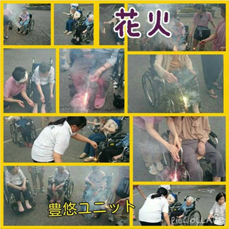 夕日がまぶしい夕方、豊悠特養の利用者さんが、みなさん外に出てこられ…何が始まるのかと思っていたら、 一面、もくもくと煙が(x_x) よくみると、みなさん手持ち花火をされていました😅 やっぱり夏は花火ですね。 嬉しい表情で花火をみておられました。