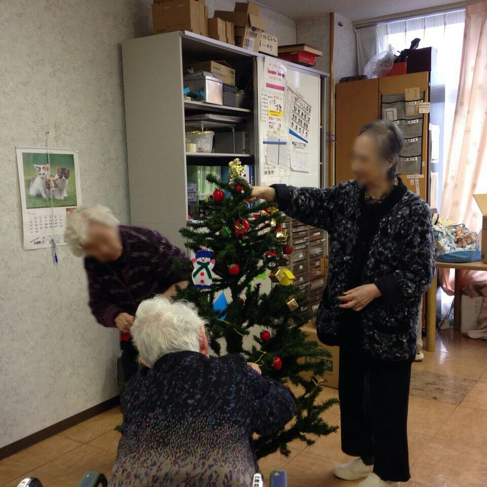 特養従来型フロアにも、大きなツリーを飾りました。 利用者さん達も一緒に飾り付け\(^_^)/