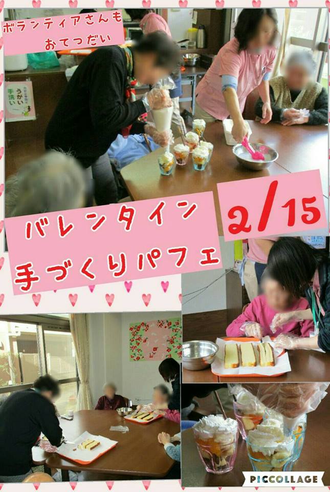 2月15日 月曜日 前日14日は バレンタインデーだったので 今回のおやつレクは 手づくりパフェ🎵 カステラ 生クリ一ム アイスクリーム等 ボランティアさんにも盛り付け お手伝いしていただき美味しく出来ました。