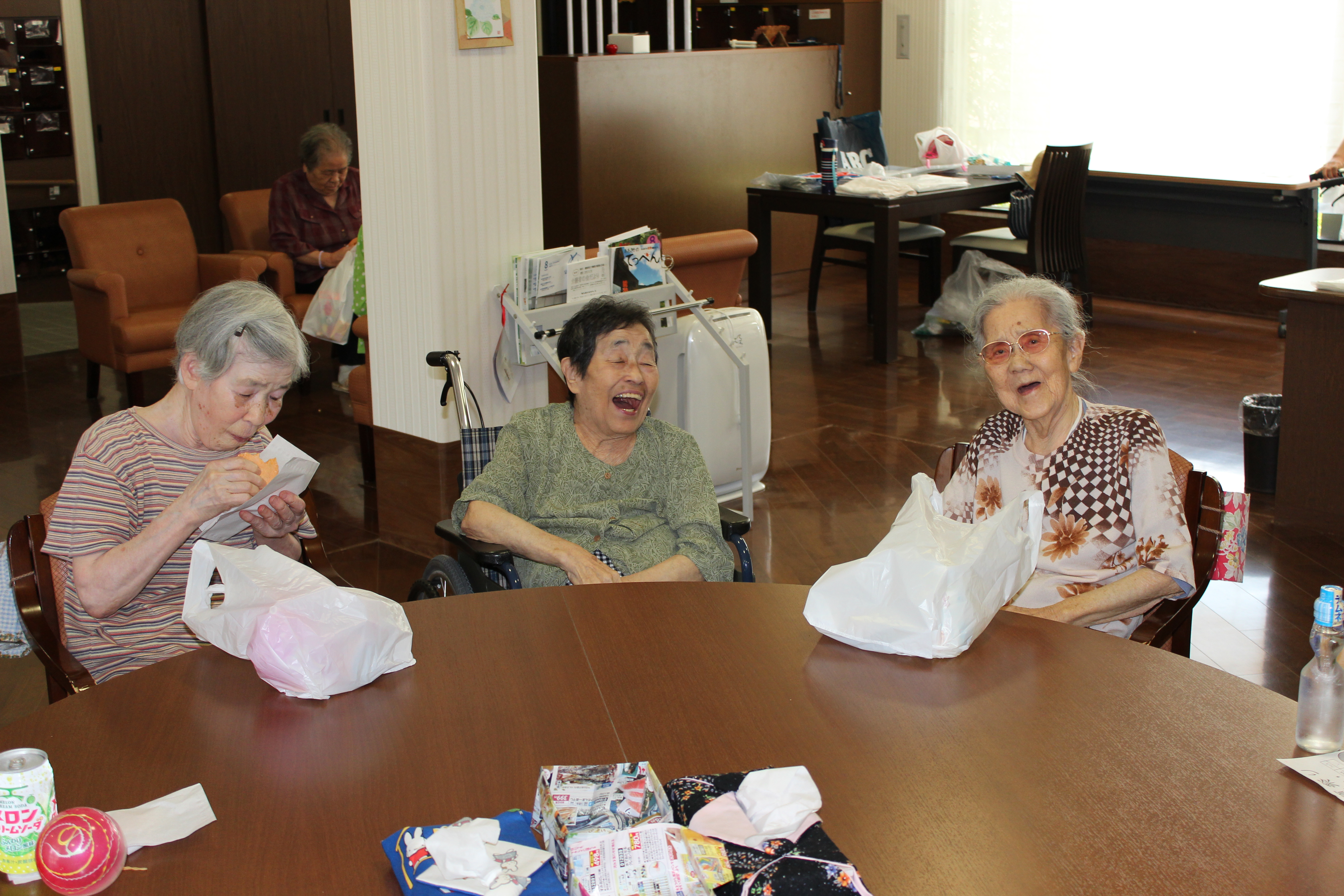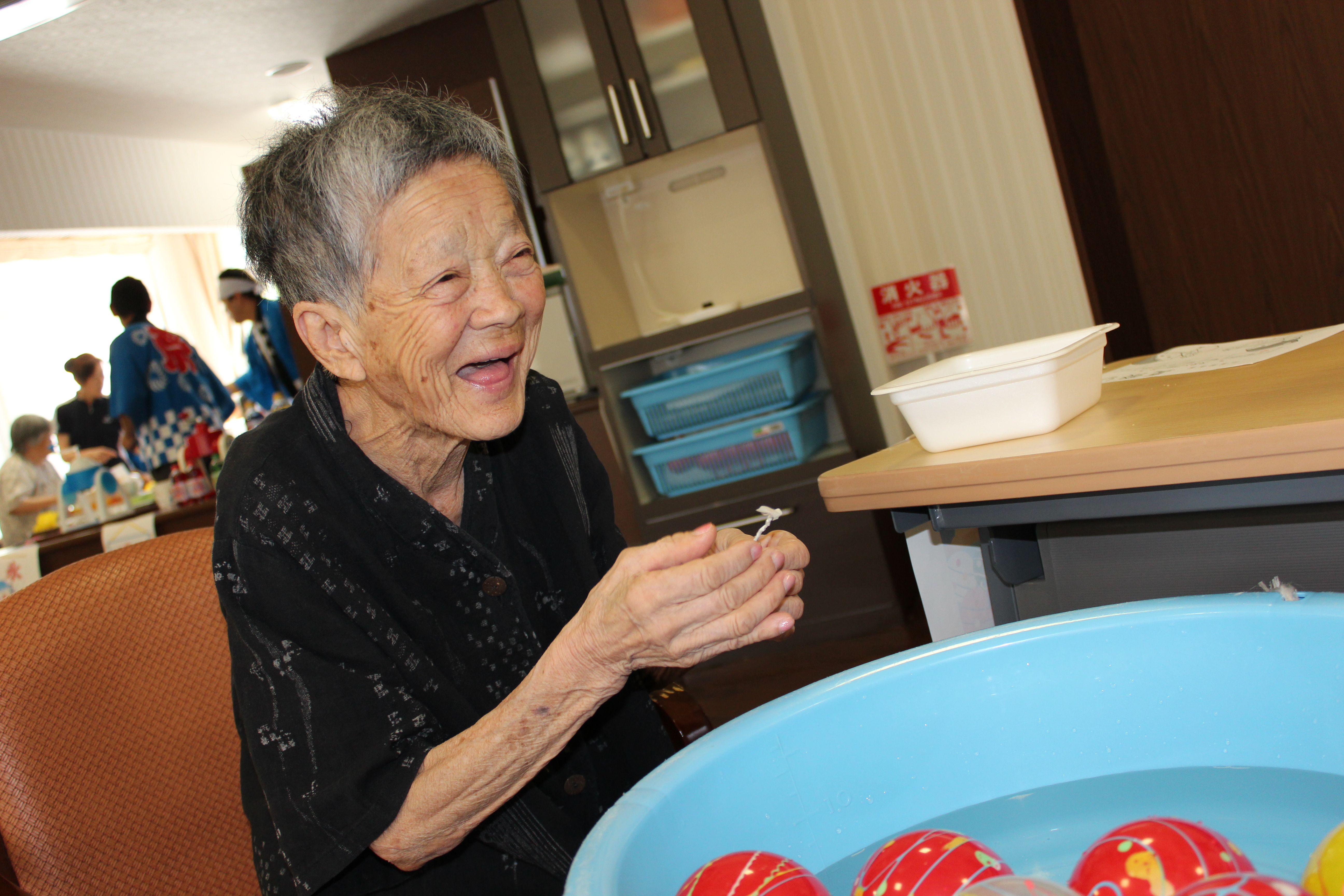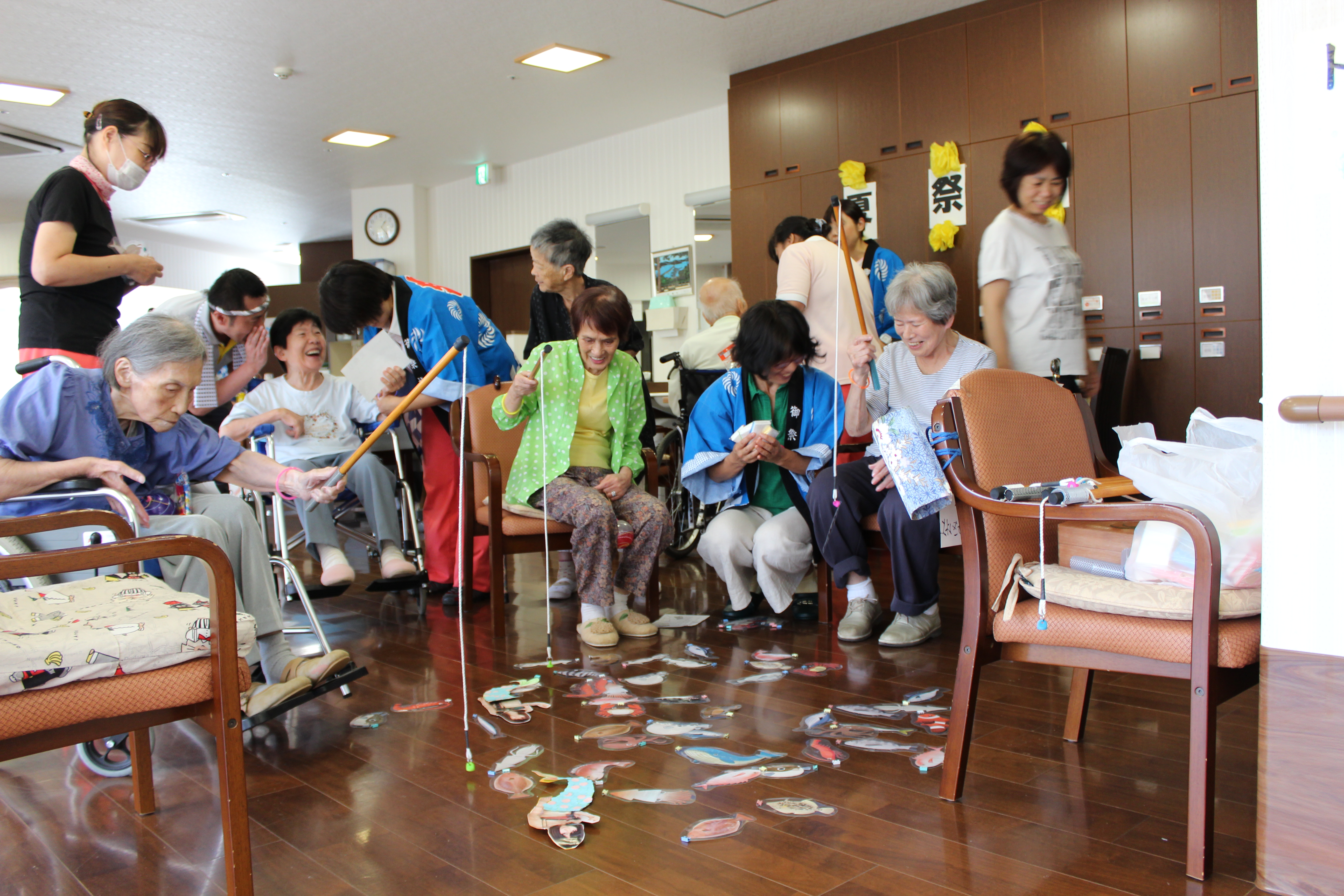 グループホームとショートステイが合同で、夏祭りをしました。 魚釣り、輪投げ、風船ヨーヨー釣り、カキ氷、一円玉落とし、たこせんなどあり、皆様に楽しんでいただけました。