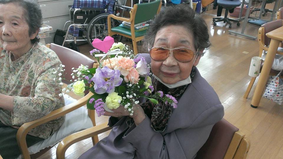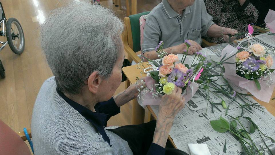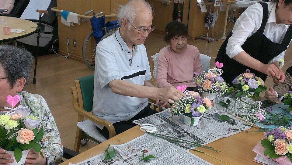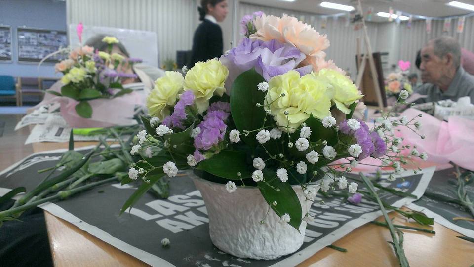 今日は外部の先生による、フラワーアレンジメントを行いました。 女性はもちろん、男性もとても良い顔をして、作成していました。出来上がった花と一緒にハイポーズ。