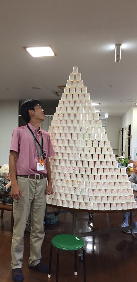 紙コップタワー再挑戦! ドキドキわくわくしながら息を止めて見守る方、抜き足差し足で歩く職員^_^。で、幅22個、高さ21個。前回よりもたくさん積め拍手喝采でした(^O^)