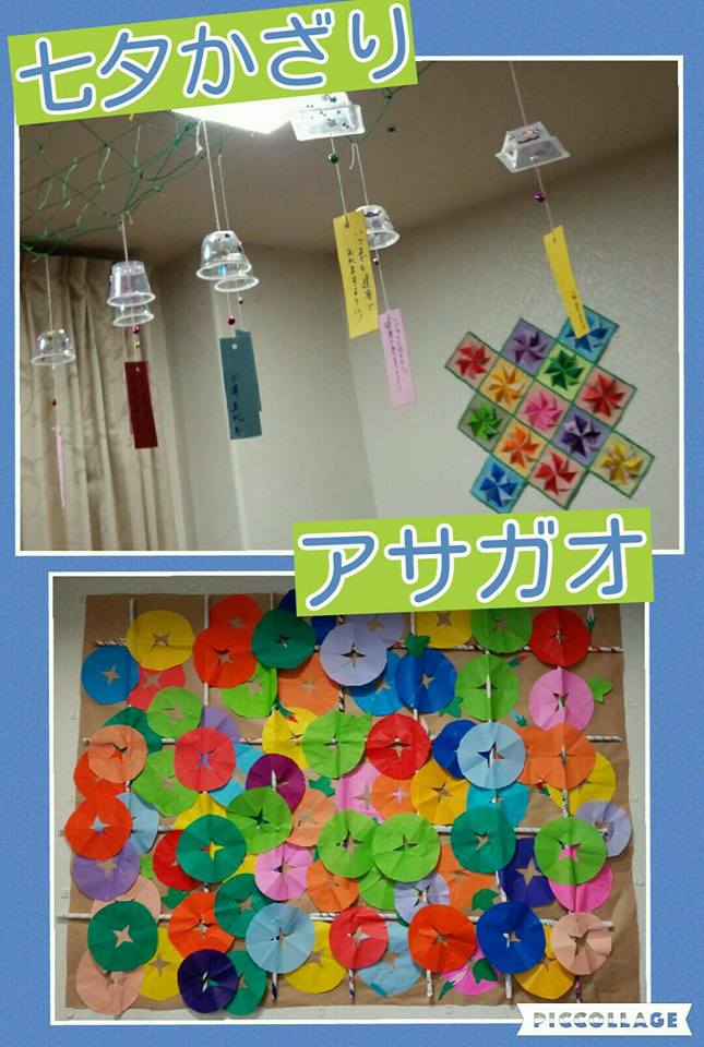 7月7日は 七夕 天の川に見立てた ネットに風鈴🎐の様に作った 七夕飾りを飾りました 皆様に願いを書いて頂きました フロアの壁は アサガオがいっぱい咲いてます🎵