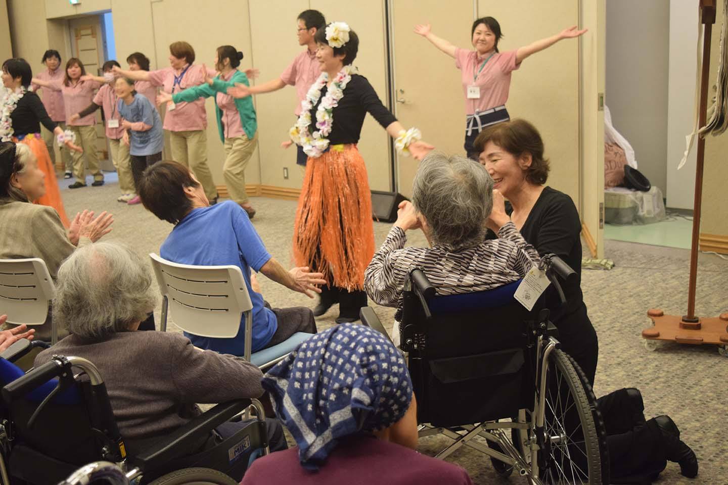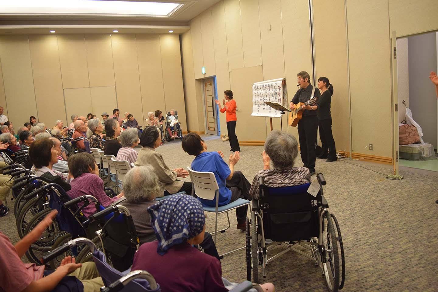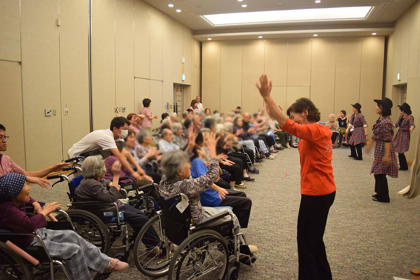 豊悠ホール♪楽しい音楽で溢れました。 7月16日 豊悠ホールへ地域のボランティアグループ「ダンス計画」のみなさんによる歌と踊りのステージで楽しませていただきました。 特養の利用者さん、新館からグループホーム・ショートステイご利用の皆さん約40名が参加させて頂き、一緒に手拍子したり、歌を歌ったりと、楽しい時間でした。 利用者さんの表情が、とても楽しそうで、穏やかに微笑まれているのがとても印象的でした。 「ダンス計画」のみなさん、本当にありがとうございました。