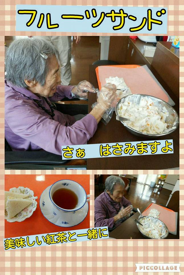 ショ一トステイホ一ム祥雲館です。 9月になり ホイップクリームを使った『フル一ツサンド』を作りました 7月からは 暑くておやつを作って食べるまでに溶けてしまう!って事に(笑) なので 久々にホイップクリームの入ったクリームサンド美味しかったです