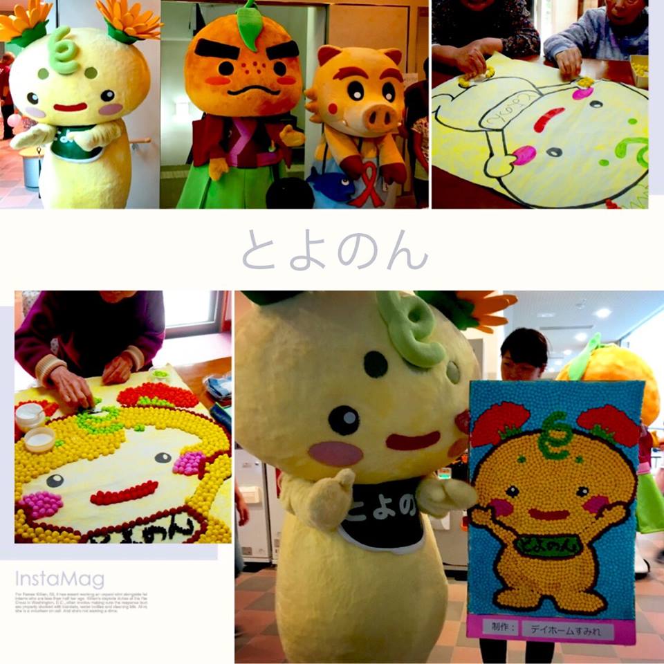 デイホームすみれです。 ゆっくりのんびり少しずつ、で 制作期間2ヶ月ちょっと。 みんなで作り上げた「とよのん」の壁画です。 祥雲館イベント「森のカーニバル」にとよのんがやってくるというので、一緒に記念撮影してもらいたくて、壁画を持っていきました(笑) 実物と比べてどうですか? なかなかのできでしょう(^^) 次は何にする? といろいろ考えている今日この頃です。