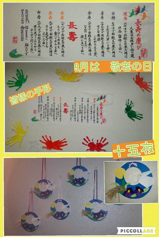 ショ一トステイホ一ム祥雲館です。 9月は敬老の日。 ショ一トステイホ一ムでは18日(日)に敬老会を開催します。 壁画は 利用者様の手形をとって 職員が持ってきた『長寿の慶び』手ぬぐいの周りにはりました 制作レクレ一ションは 十五夜の飾りです 9月もイベント盛りだくさんですので 宜しくお願い致します