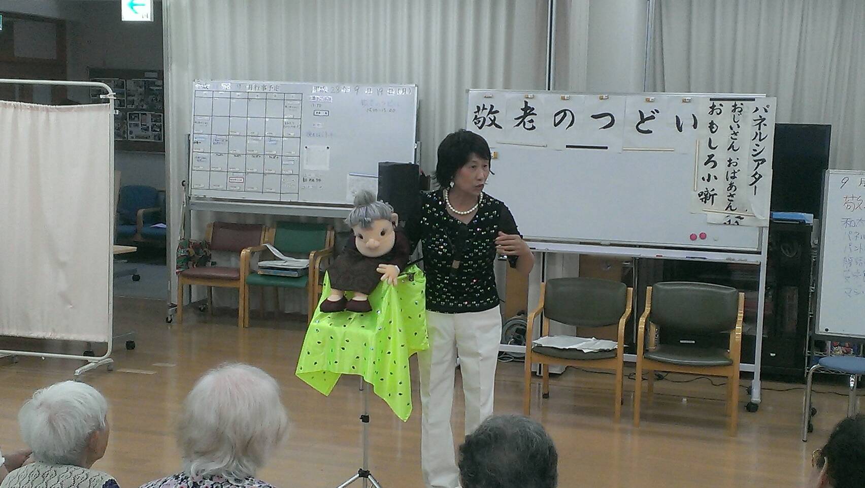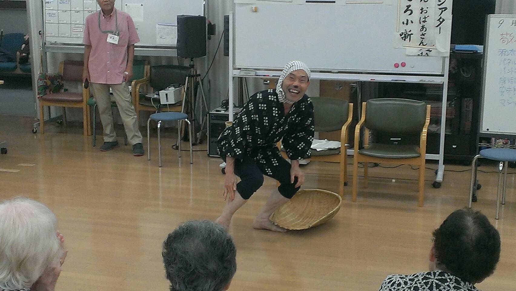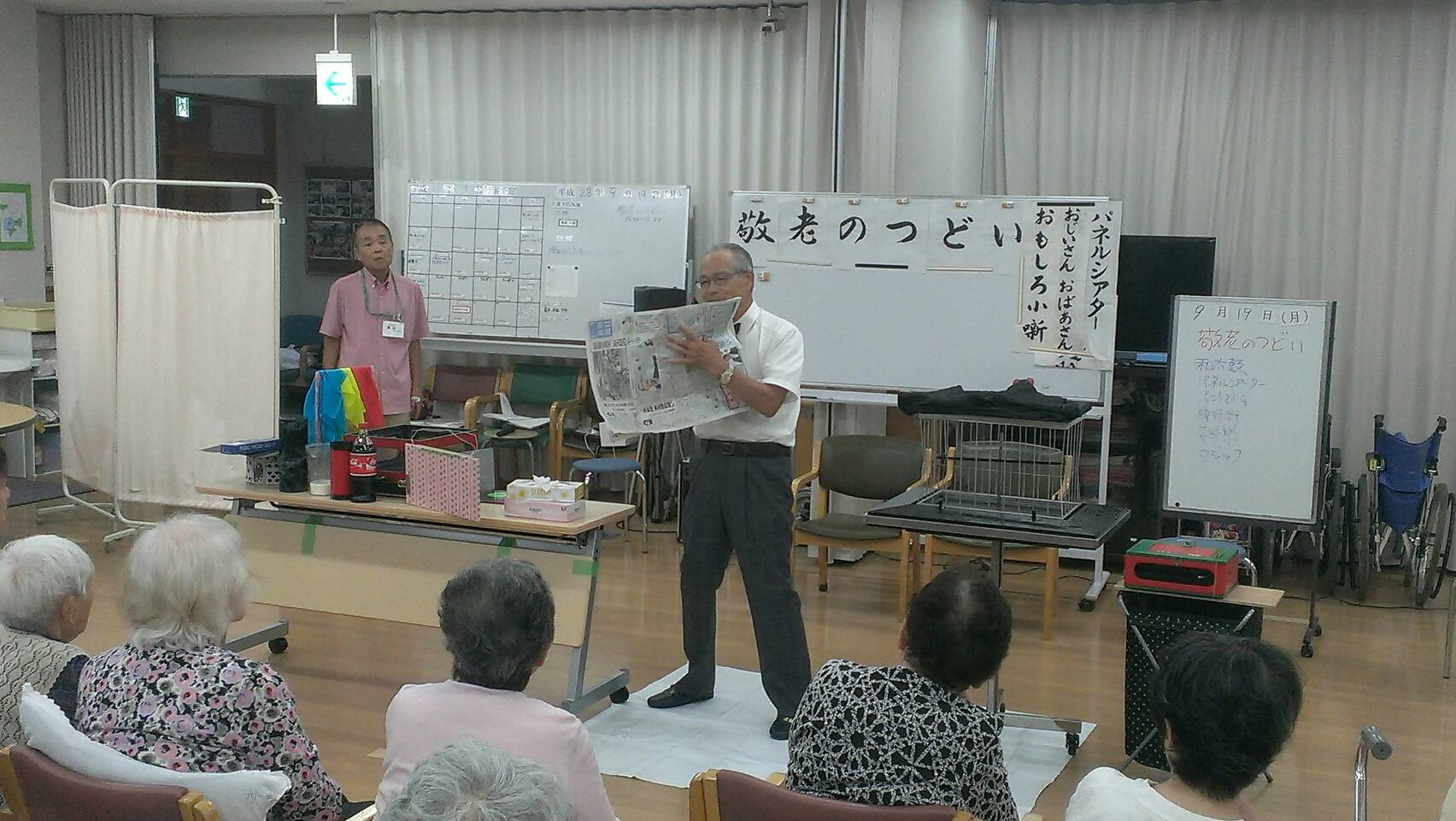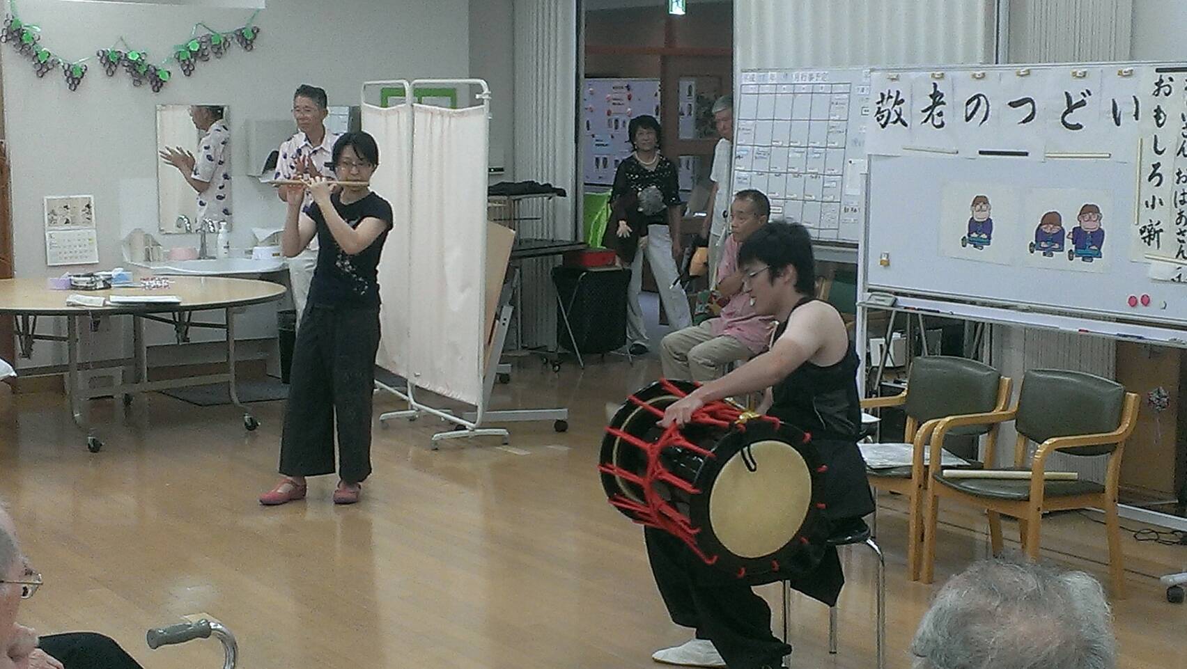 今日は敬老の日。 ボランティアさんや、職員による出し物で、楽しんでいただきました。 太鼓の演奏、小噺、腹話術、安来節、マジック ・・・ 皆さんとても喜ばれました。