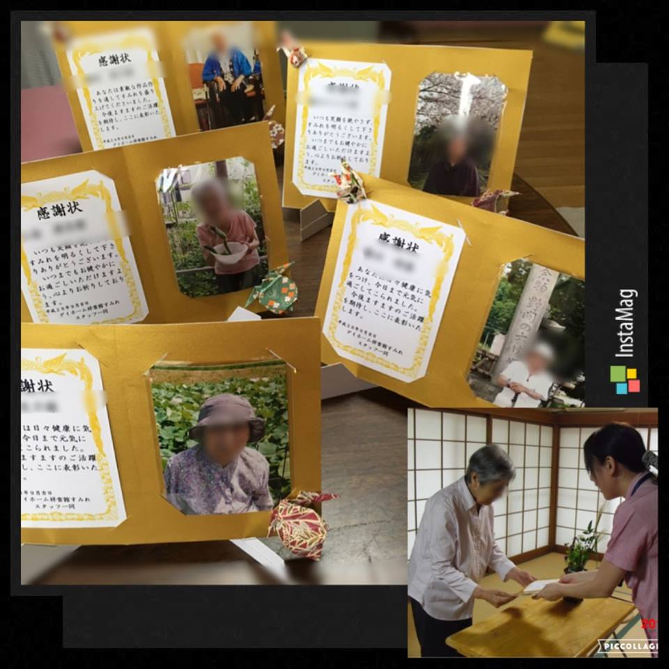 デイホームすみれでは、 敬老の日にちなみ、ささやかですが長寿を祝うお祝いをさせていただきました。 敬老会の最後には、笑顔ですみれに通って来てくださり、また楽しく作品作りをされている皆様に、私達の気持ちを「感謝状贈呈」という形で送らせていただきました。 卒業式のような雰囲気に、皆さん緊張した面持ちで受け取ってくださり、「いい記念になるわ。」と喜んでいただけました(^^) 皆様、 これからもお元気でお過ごしくださいね。