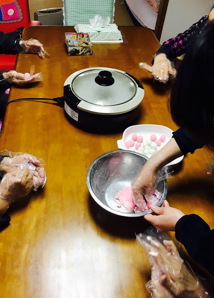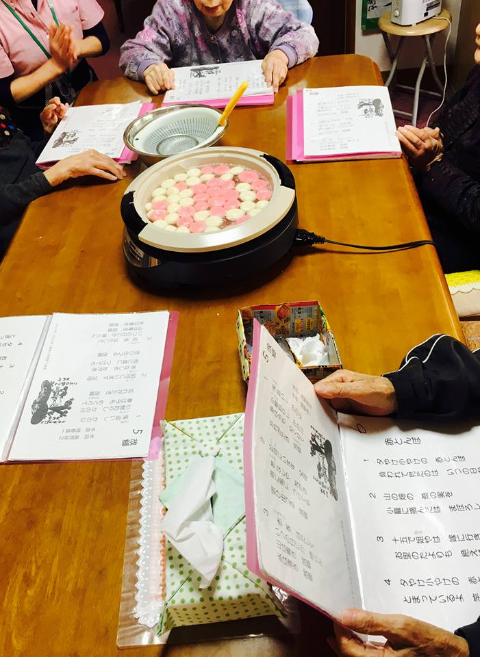 運転手さんが、庭に咲いた梅の花を持ってきてくださいました。 梅の花を愛でながら 紅白だんごいりのおぜんざいで、 ほっこりあたたまるおやつです。 みんなでまあるく丸め、 茹でている間、歌を歌って出来上がりを待ち、 そして美味しくいただきました(^^)