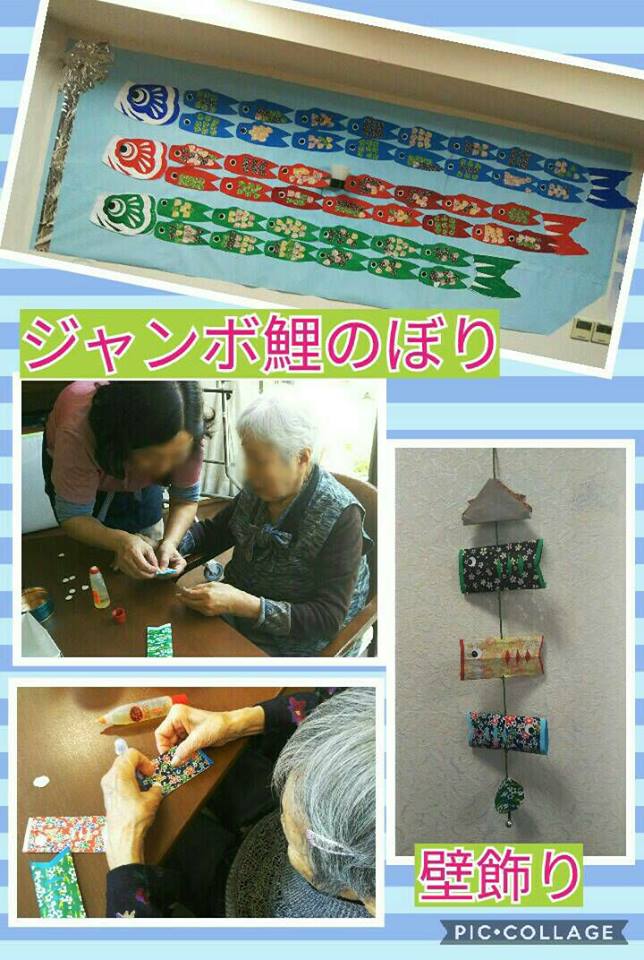 端午の節句の今月は 壁一面にジャンボ鯉のぼりを作りました。 あまりの大きさに 作った利用者様もビックリ!!! 壁飾りには鈴がついており 風に揺られてチリ〜ンチリ〜ンって鈴の音を響かせてます
