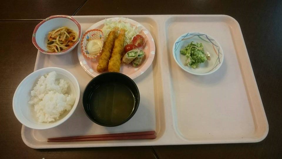 〜月に一度の昼食作り(たんぽぽユニット)〜 たんぽぽユニットは、エビフライ&豚肉のおくら巻きを作りました(^-^)
