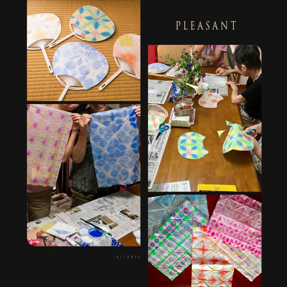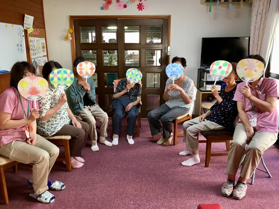 今月の個別アクティビティはうちわ製作をしました。 障子紙を小さく折り、それにお好きな色をつけます。 紙を開いた時、自分の作り上げた模様に歓声が上がります。 とても楽しくて、スタッフもはまってしまいました(^^) うちわにして持って帰っていただきました♪ 暑い夏もあと少し…かな。 体調崩さぬよう乗り切りたいです。