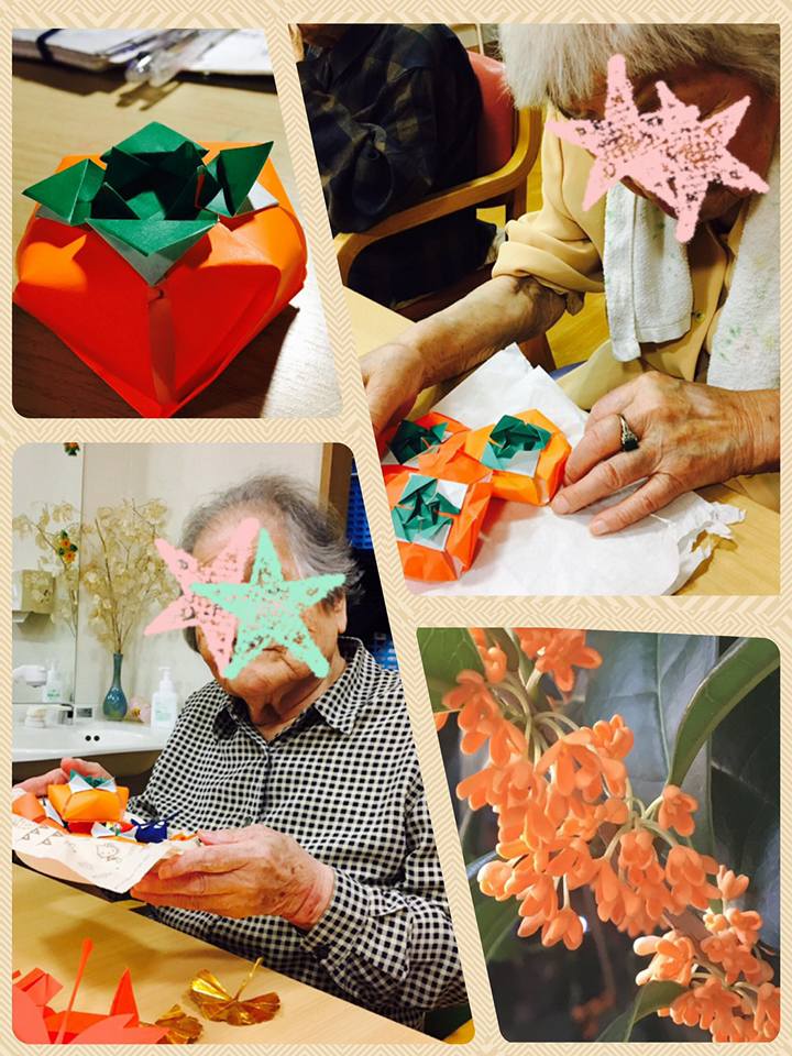 10月2日は、月に一度の食事作りの日です。 10月という事で、利用者様にも参加して頂き、行楽弁当を作りました! 晴れていれば、外にテーブルを出し、秋を感じながら召し上がって頂く計画でしたが、あいにくの雨☔️ ちょっと残念な気持ちでしたが、食事後は、折り紙で秋の味覚の柿を折って季節を感じて頂きました。