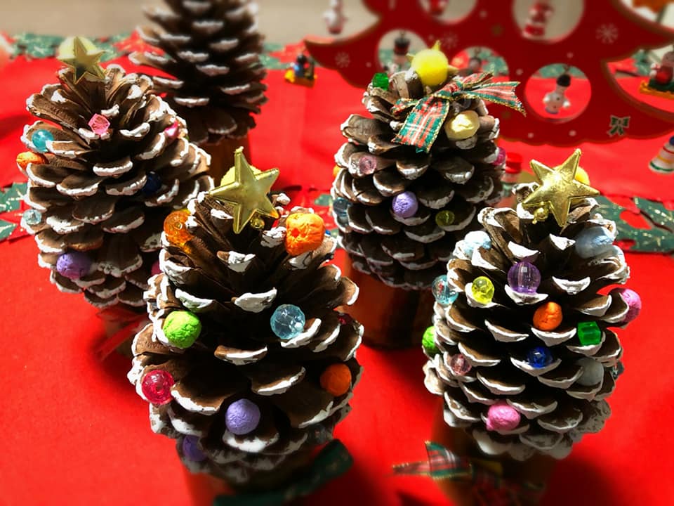 すみれでも、クリスマスの準備が着々と進んでいます^_^ 毎年、12月はクリスマスにちなんだ小物を作って持ち帰って頂いているのですが、今年は松ぼっくりツリーです。 ゴルフ場で拾ってきてきた巨大松ぼっくりに絵の具で雪を積もらせ、ビーズで飾り付け。 ステキな作品に仕上がりました。利用者さん全員に作ってもらう予定です♪ クリスマス気分を楽しんでいけると良いですね。