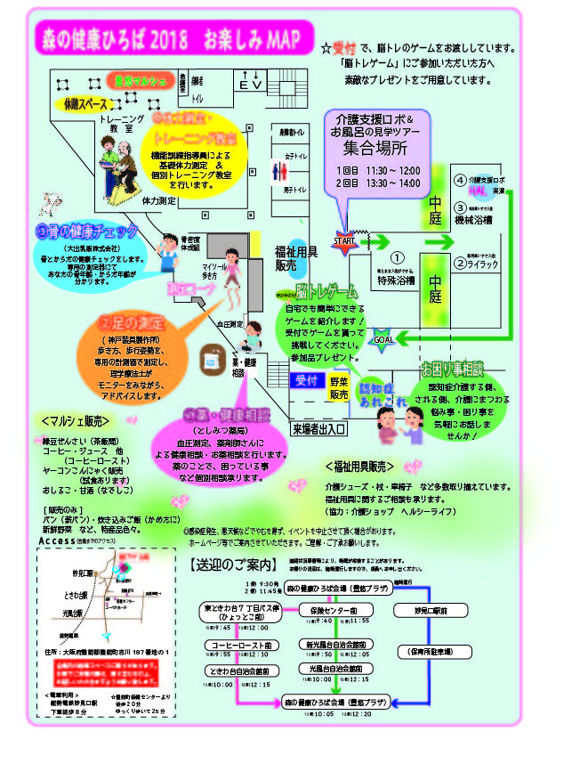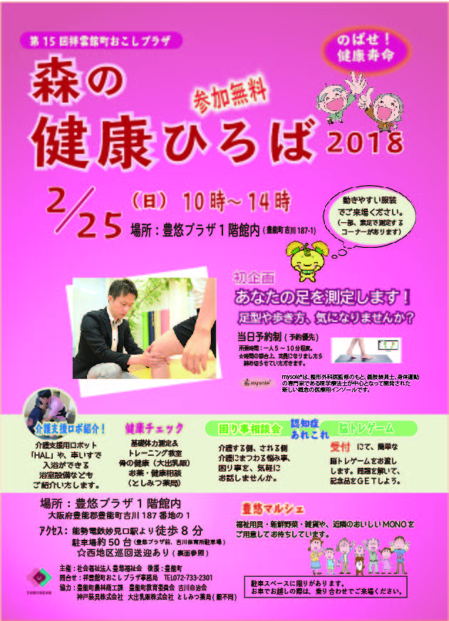 『森の健康ひろば2018』 今年で3回目の開催の『森の健康ひろば』です。 今年も健康寿命を伸ばそう!をテーマに開催します。 【場所】社会福祉法人 豊悠福祉会 豊悠プラザ 大阪府豊能郡豊能町吉川187-1 【アクセス】 能勢電鉄「妙見口駅」下車 徒歩8分 豊能町西地区巡回送迎あります。 【問い合わせ】 電話 072-733-2301 祥雲館町おこしプラザ事務局まで ☆☆主な内容☆☆ ⚫足の測定(マイソール) 協力:神戸装具製作所 ⚫骨の健康チェック 協力:大出乳業さん ⚫薬相談会 協力:としみつ薬局 ⚫介護支援ロボット&お風呂場見学会 ⚫認知症あれこれ ちょっとしたこと相談会 他 イートイン&休憩スペースあります。 ⚫コーヒー、甘酒、ぜんざい、緑豆ぜんざい 販売。 ⚫豊悠マルシェ こんにゃく、パン、炊き込みごはん、 新鮮野菜 など販売します。