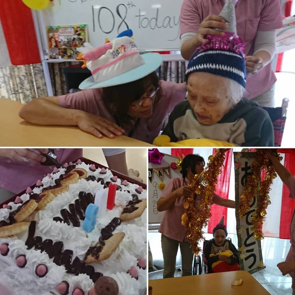 happybirthday 108歳 ★2018年9月25日★ 特別養護老人ホーム祥雲館で 最高齢の利用者さんの 108歳の誕生日会 6月には“祥雲館ファッションショー”にも出演いただき、まだまだお元気な利用者さんです。 大きなケーキを作って、み〜んなでお祝いしました。
