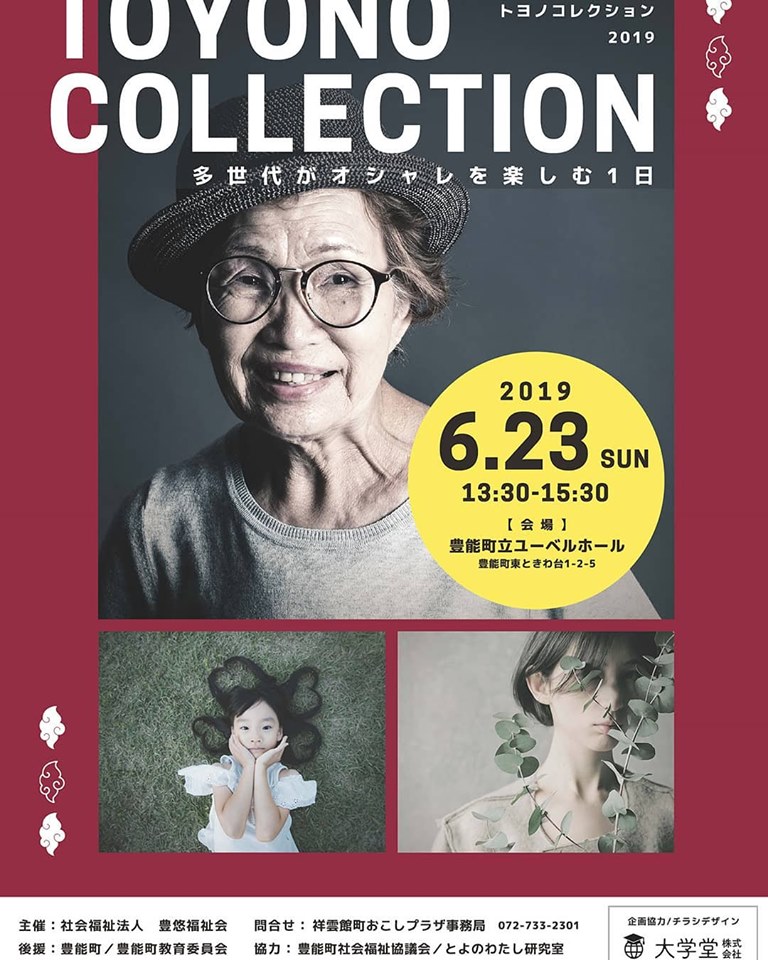 6月23日開催 祥雲館 「TOYONO COLLECTION2019」 TOYONO COLLECTIONは、「多世代がオシャレを楽しむ1日」として豊能町に住む方々の思いをファッションで表現するファッションショー。 祥雲館をご利用の高齢者、障がいの方、豊能町にお住まいの方が、自分らさを表す衣装を着て「ユーベルホール」のステージでランウェイを歩く。 ステージでのパフォーマンスだけでなく、会場みんなが盛り上がるイベントです 当日のイベント運営を学生さんに手伝ってもらいます。この機会に若い世代にも豊能町の魅力を伝えたいです。 私たちと一緒に、楽しい時間を過ごしませか 【開催日時】2019年6月23日(日) 13:30〜(開場12:45) 【開催場所】豊能町立ユーベルホール(入場無料) 【スケジュール】 13:30 開会・太鼓演奏(わらべっこ・爽風) 14:00 ファッションショー 15:20 記念撮影・フィナーレ 15:30 閉会 [問い合わせ]電話072-733-2301 祥雲館町おこしプラザ事務局 #ファッションショー#TOYONO #TOYONOCOLLECTION#豊能町#北摂#箕面#能勢#川西#地域福祉#社会福祉HERO'S#豊悠福祉会#祥雲館#高齢者施設 #障がい者支援#モデル#豊能町をより元気に#ユニバーサルデザイン #サプール風コーデ#ユニバーサルデザイン和服#ウェディングドレス#インターンシップ #就活