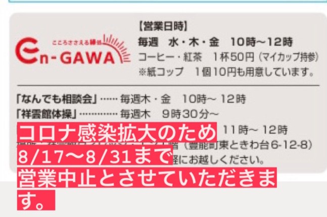 また、地域交流スペースEn-GAWAの営業についても、8/17〜8/31まで中止とさせていただきます。