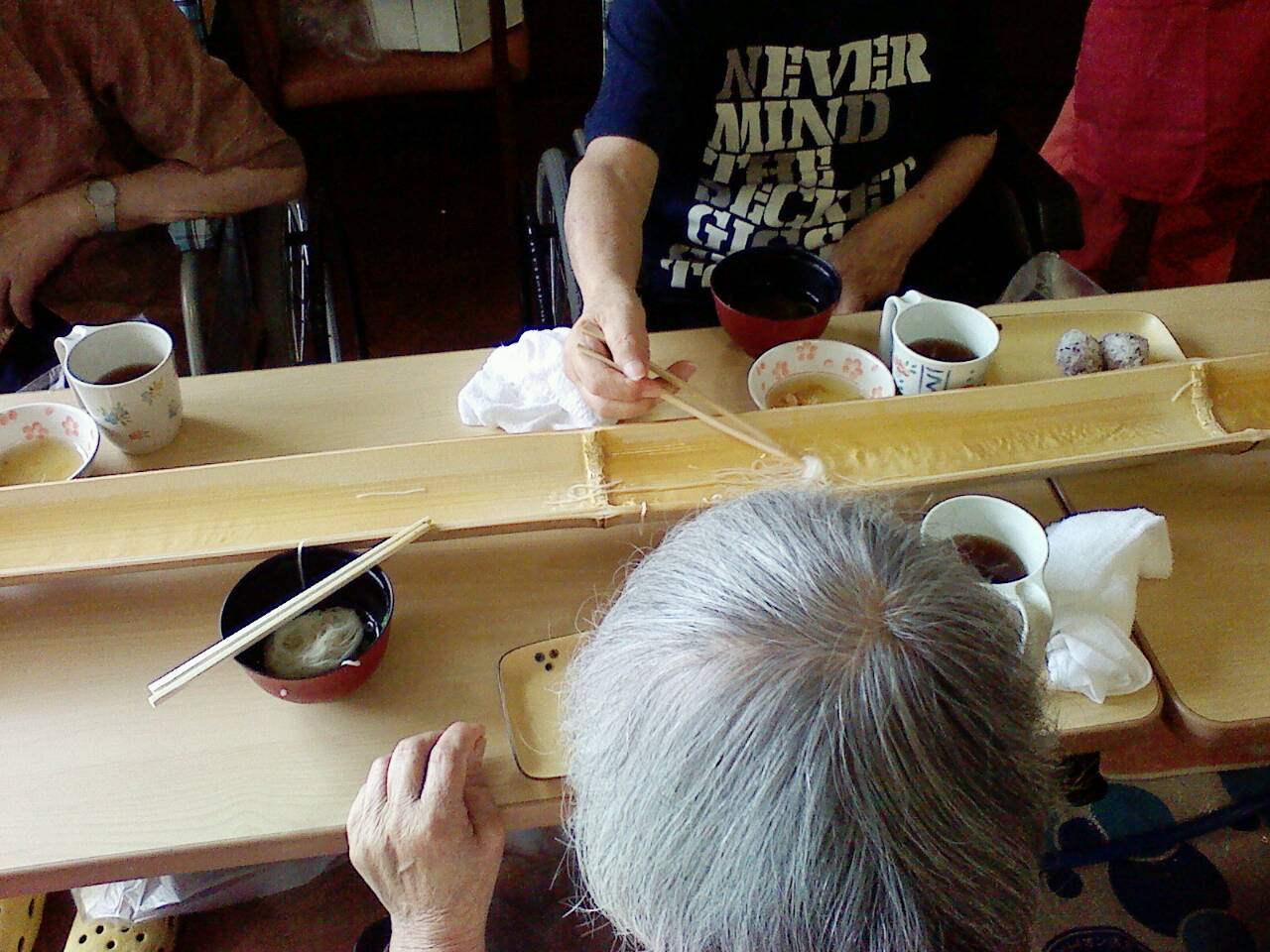 デイあじさいで、そうめん流しをしました。 流れてくるそうめんをキャッチ! たくさん召し上がられていました。 「楽しかった〜 一生の思い出になります。」とおっしゃる利用者さんもいました。
