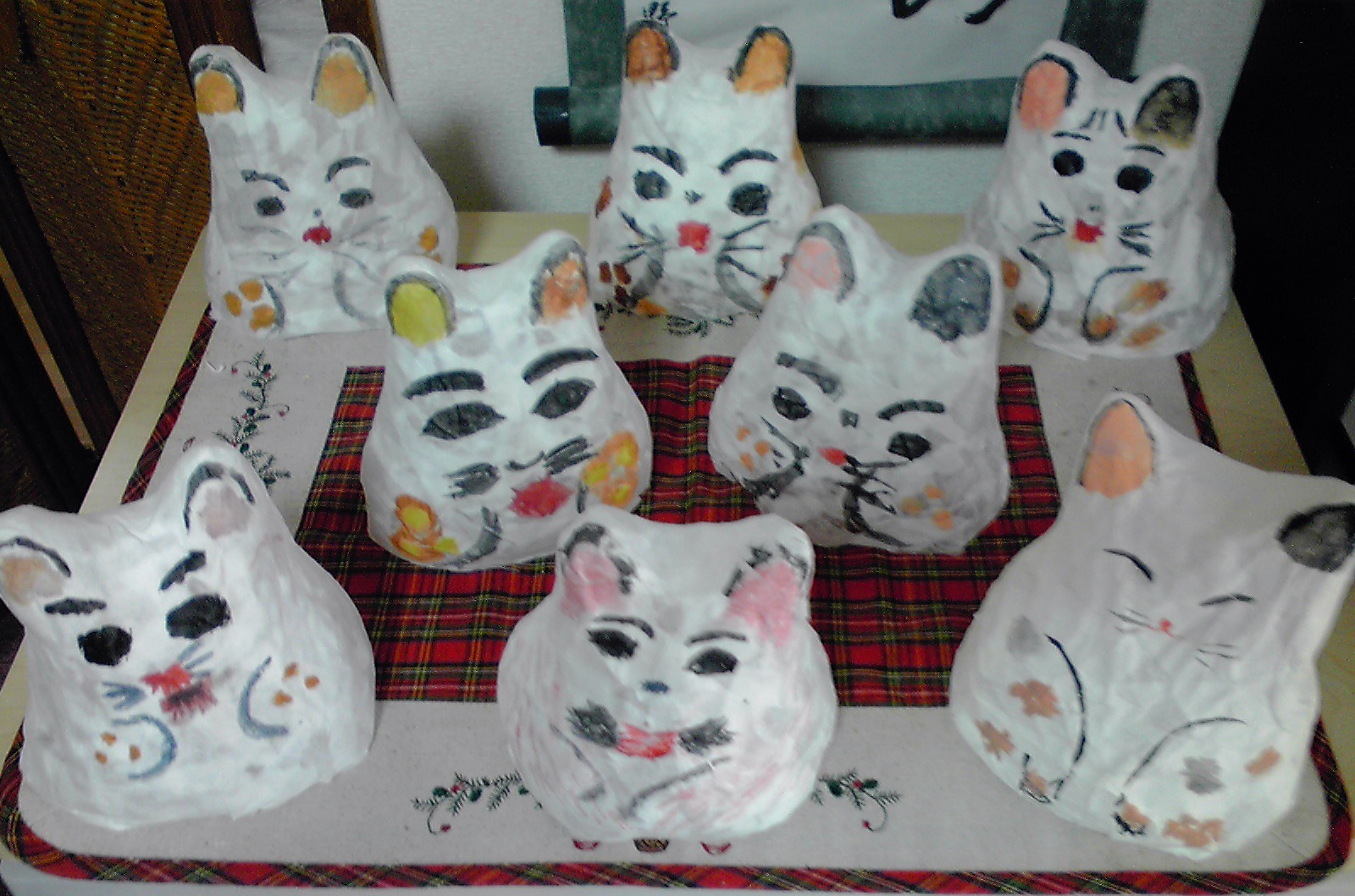 デイホームすみれで作製中の「猫ちゃんのランプ」 やっと出来上がりました。1ヶ月かかりましたが、可愛い猫ちゃんランブが完成しました。 新聞紙で土台を作りその上に和紙を張ります。乾燥後、型から抜き取り個々に顔を描きました。 それぞれ個性的な猫ちゃんです。中にランブを入れると紙の加減で光が放され皆さん満足されていました。